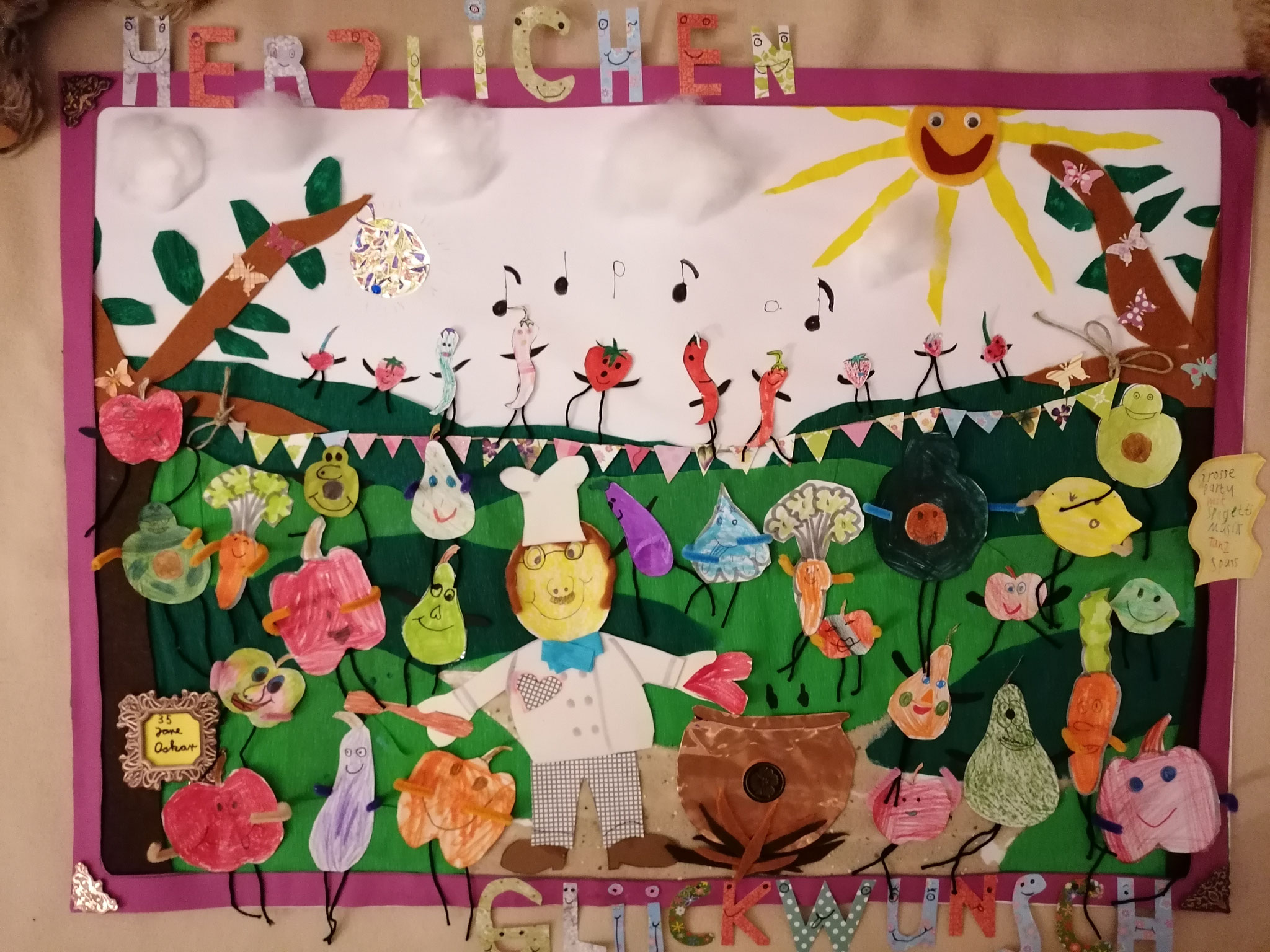 Wir bieten unseren Kindern ein abwechslungsreiches und vollwertiges Mittagessen und achten dabei auch auf ausreichend Gemüse und Rohkost. Dazu reichen wir nachmittags zum Beispiel Obst und Vollkorntoast mit Kresse.